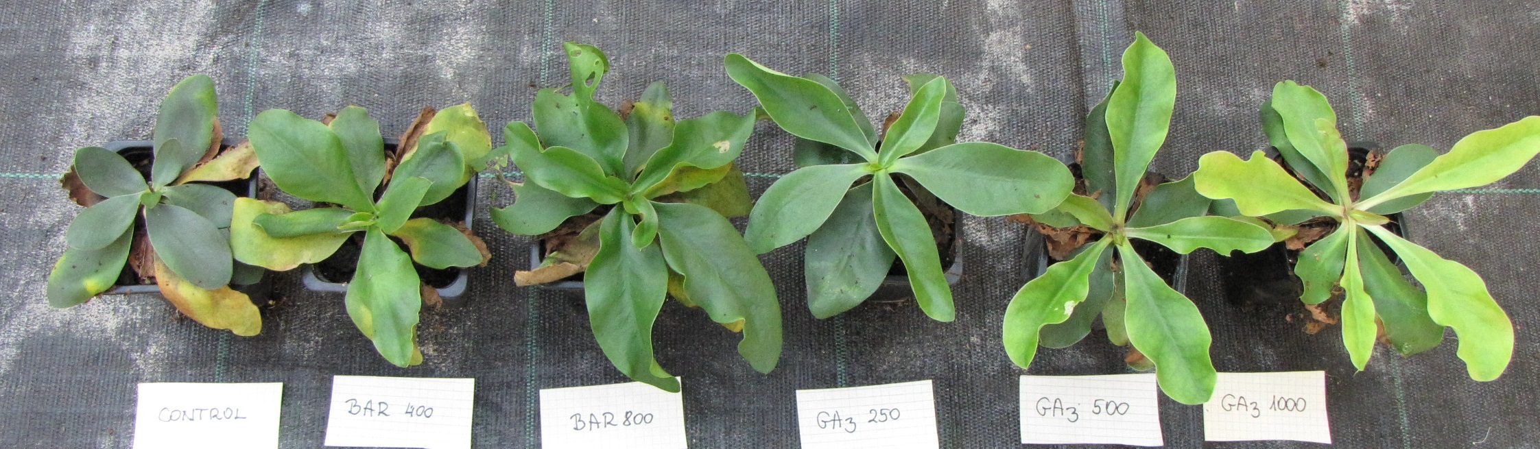 A kutatásainkban szereplő taxonok lágyszárú évelők. Az évelő növények általában a szaporítást követő évben virágoznak, mert a generatív fenológiai fázis jarovizáció hatására következik be. Az általunk vizsgált taxonok közül a Tripolium pannonicum és az Inula britannica már az első évben virágzott, ami nagy előny a termesztés hosszának szempontjából. A Limonium gmelinii subsp. hungaricum palánták azonban csak a második évtől kezdtek virágozni, ezért a termesztési ciklus rövidítése érdekében növényi növekedésszabályozók segítségével próbáltuk a növényeket már az első évben bevirágoztatni. 500 és 1000 ppm töménységű gibberellinsavas kezelés hatására a növények egy része bevirágzott. A hormonkezelések, ahogy a felvételeken is megfigyelhető, a kontrollnál jóval nagyobb növényméretet és világosabb lombszínt (klorofilldefektus) eredményeztek.
